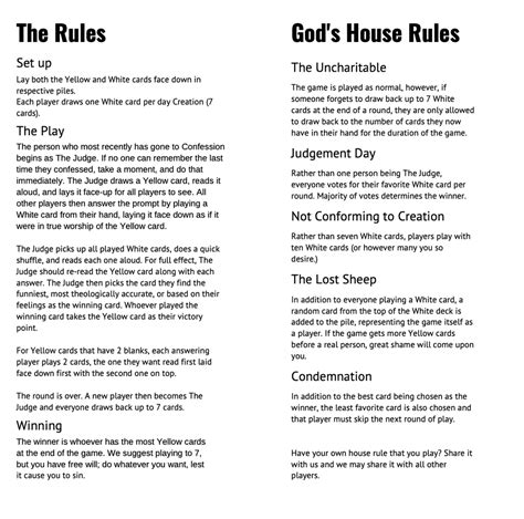 At the same time, it teaches you fun facts about catholicism while making you use your mind for creativity and communion. The disciplines are rules of a game at which he's going to lose, but. Prompts (yellow) and answers (white) a yellow card is played by the judge and all other players lay down a white card from their hand that they.